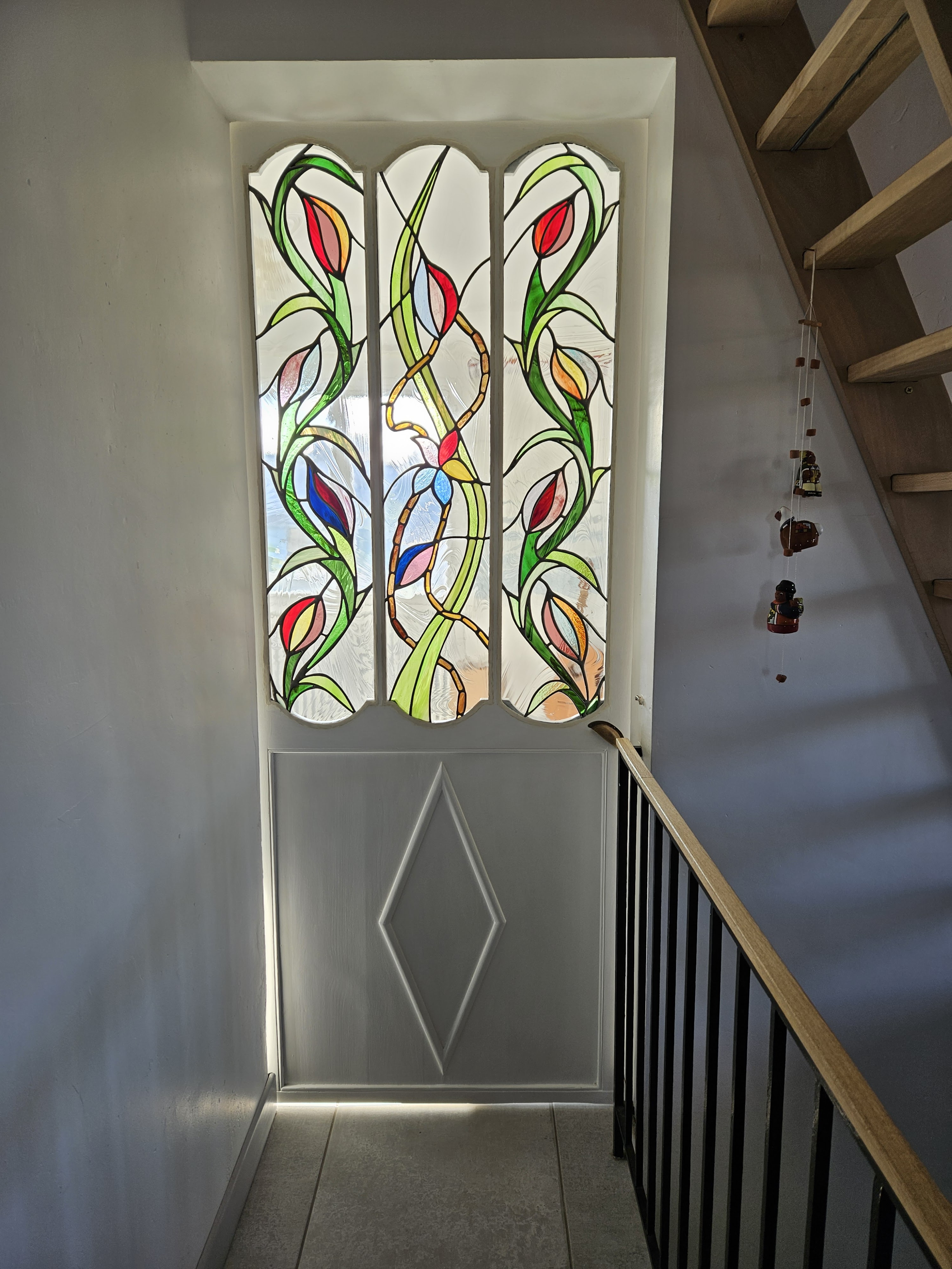 Nous avons rencontré Jean Jacques Joujon pour lui demander de réaliser un vitrail en tryptique pour une porte intérieure. Il nous a fait différentes propositions à partir de nos goûts et tout au long du processus de création il a fait preuve d'une écoute et d'une disponibilité remarquables. Nous sommes enchantés de son ouvrage et trés heureux d'avoir osé abriter une oeuvre d'art chez nous !